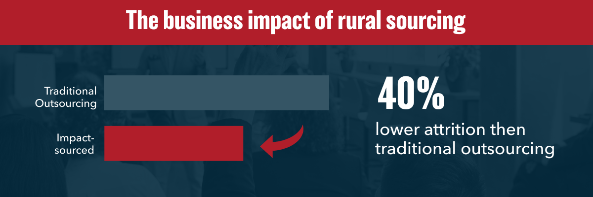 - Impact sourcing. Hiring in rural U.S. communities and among military families produces longer tenures and stronger commitment. Analyst research consistently finds that retention is 60 to 85 percent higher than in traditional outsourcing models.